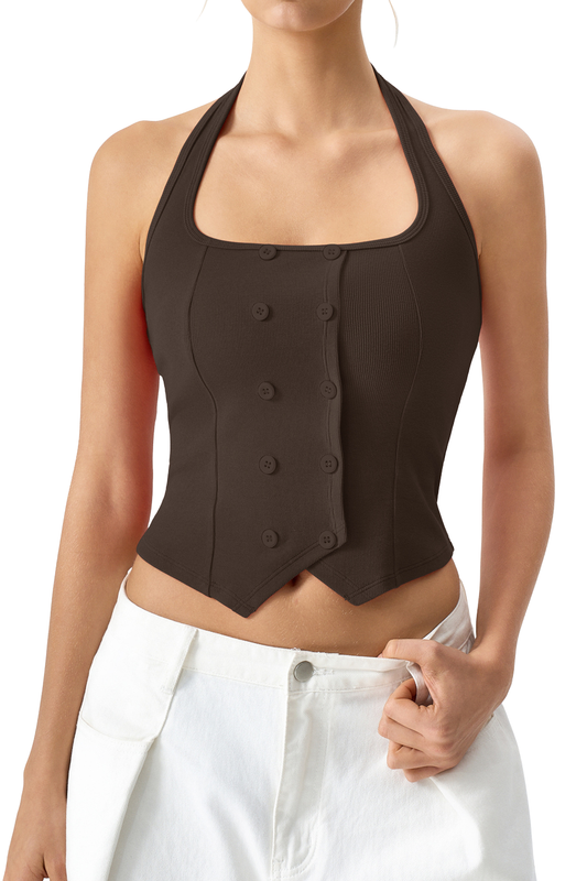 QINSEN Sleeveless Tank Top for Womens Halter Neck Button Trim Slim Fit Cropped Tee Shirt Y2k Vest Top